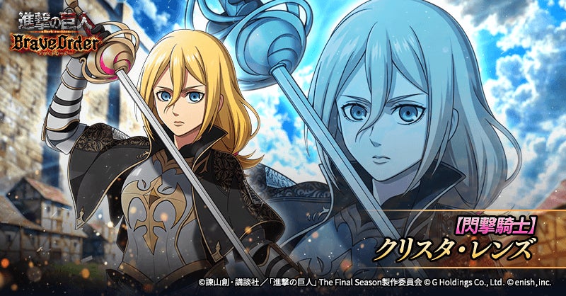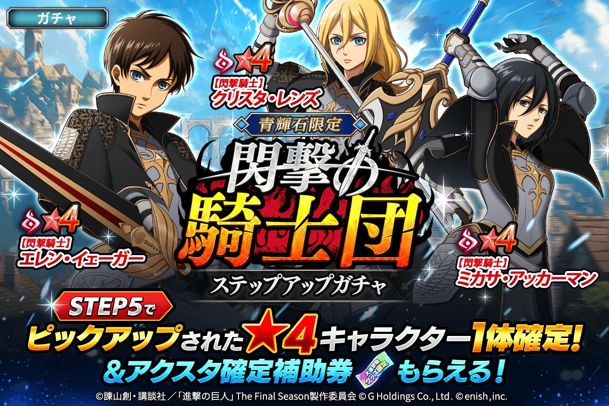 新ガチャでは、閃撃騎士エレン、ミカサ、クリスタが登場し、ステップアップガチャでは★4団員が1体確定します。