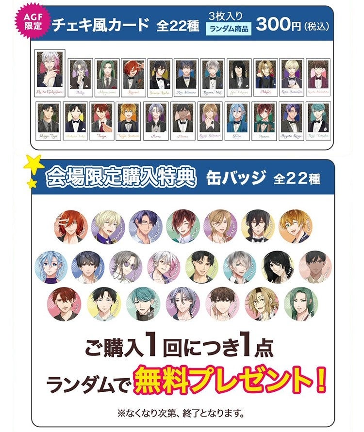 会場限定でアクリルスタンドやアクリルキーホルダーなどのグッズが販売され、さらにグッズ購入者にはオリジナル缶バッジがプレゼントされます。