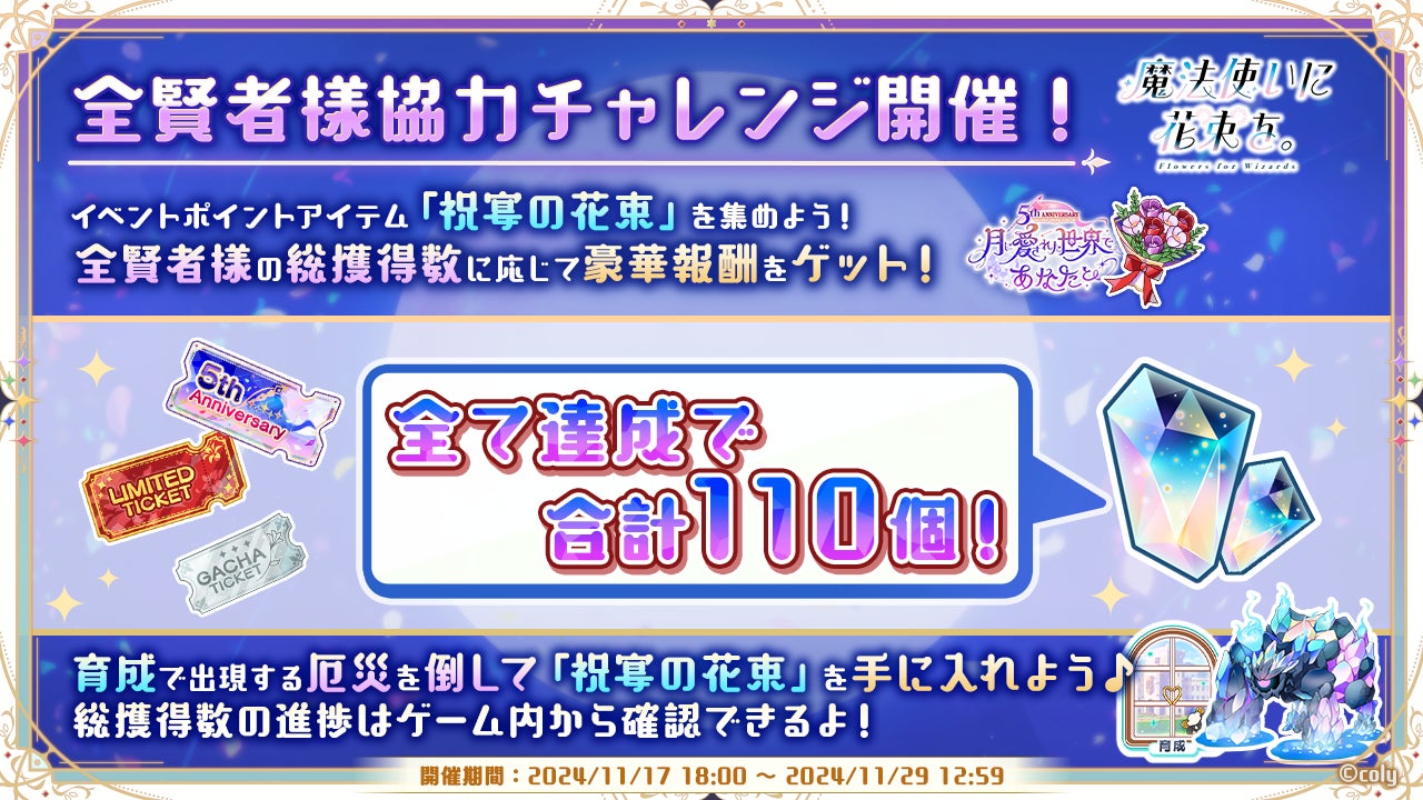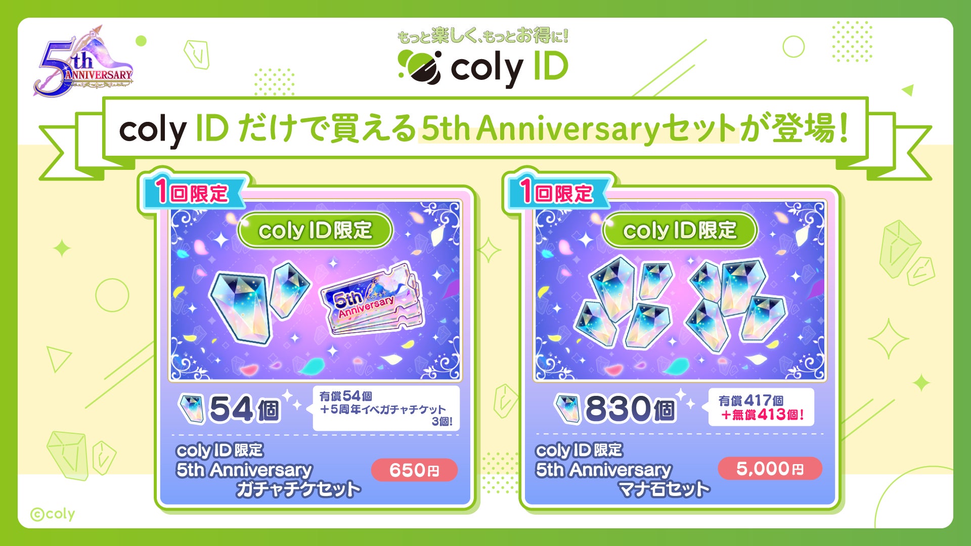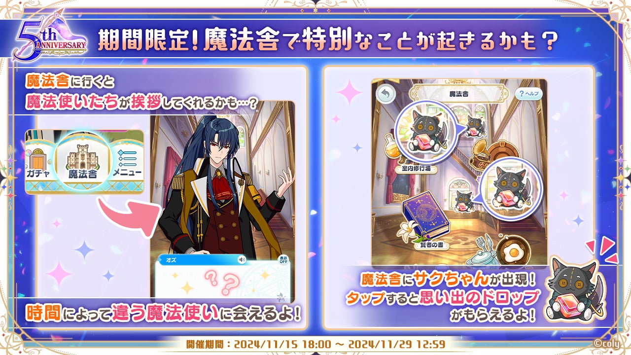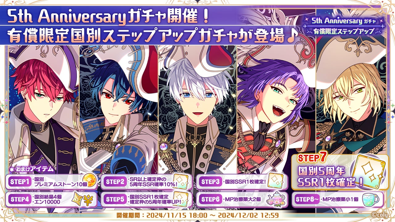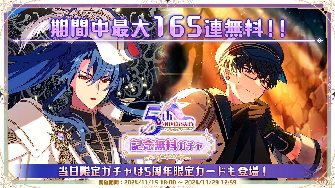 - 5周年記念イベントやガチャ、ログインボーナスなどがゲーム内で開催。