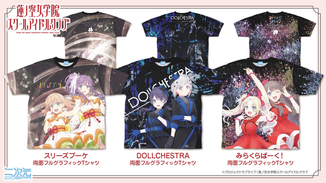 新商品は「両面フルグラフィックTシャツ」で、スリーズブーケ、DOLLCHESTRA、みらくらぱーく!のデザインがあります。