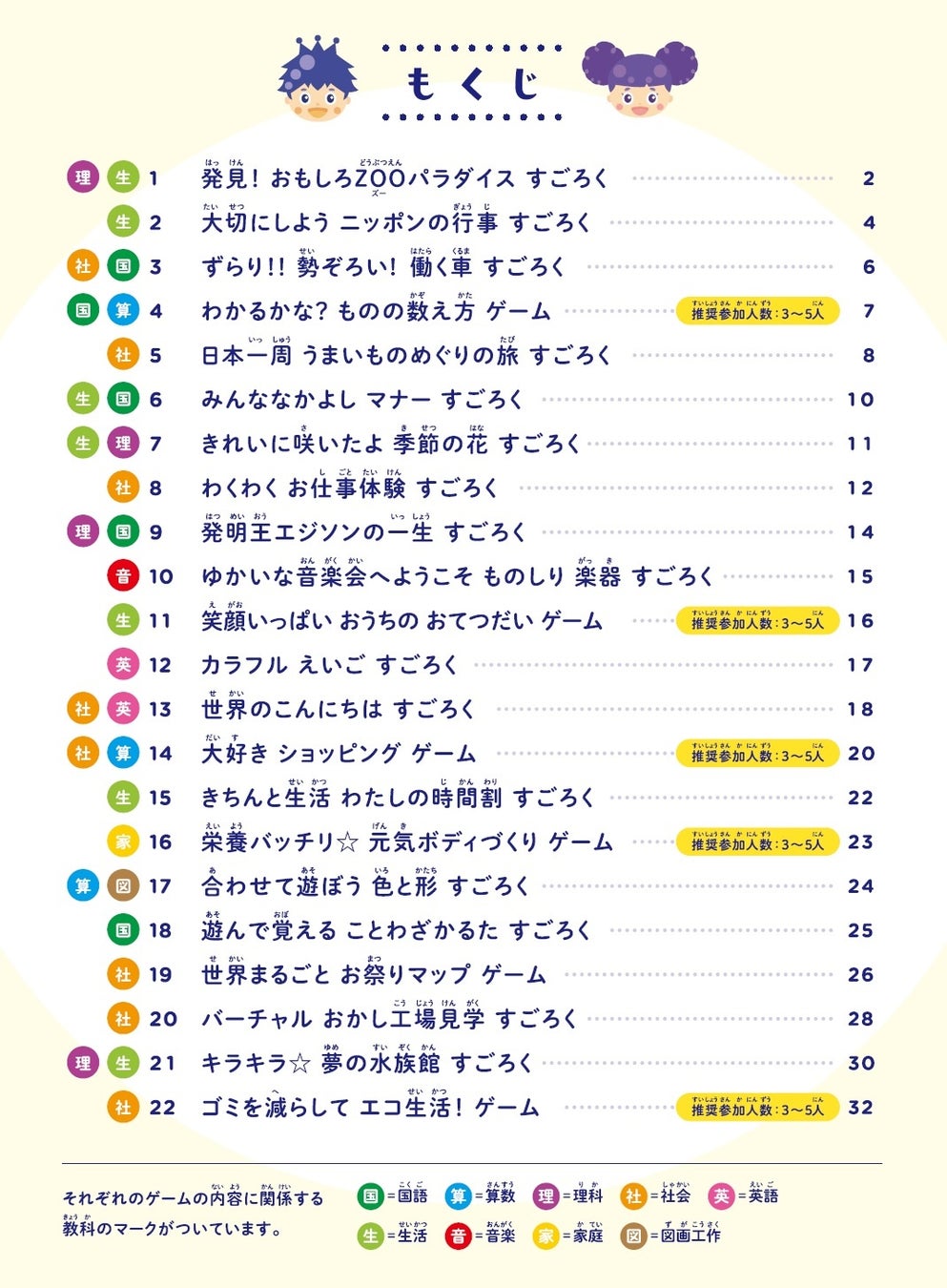このすごろくゲームブックは、家族で楽しめる22種類のすごろくが収録されており、算数、国語、理科など、学習要素を取り入れながら遊べるのが特徴です。