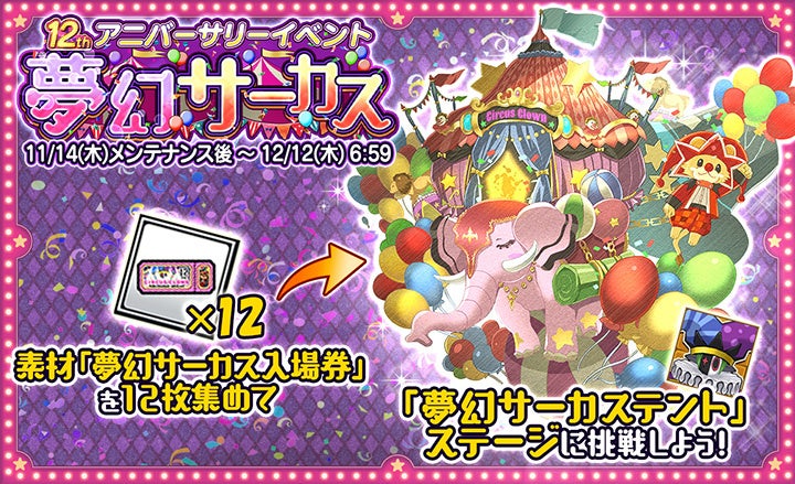 アクションパズルRPG『ケリ姫スイーツ』がサービス開始12周年を迎え、アニバーサリーイベント「夢幻サーカス」を2024年11月14日(木)から開催。