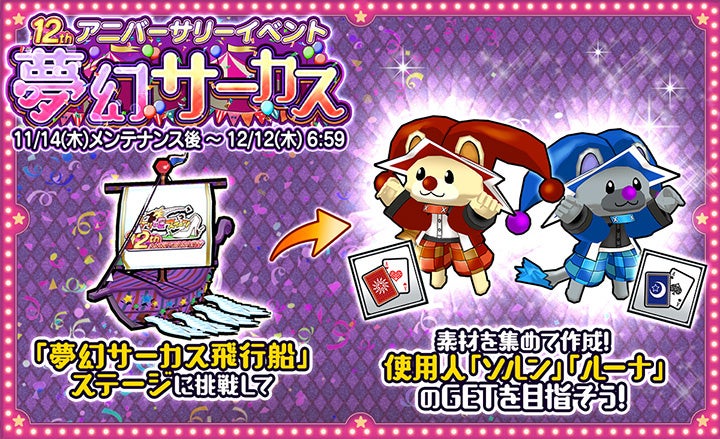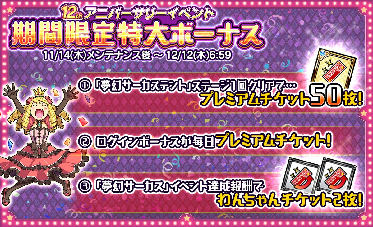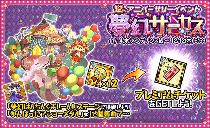 イベントでは、新ステージ「夢幻サーカステント」「夢幻サーカス飛行船」「夢幻ぱんちんぐましーん!」が登場し、プレミアムチケットや「わんちゃんチケット」などの報酬を獲得できるチャンス。