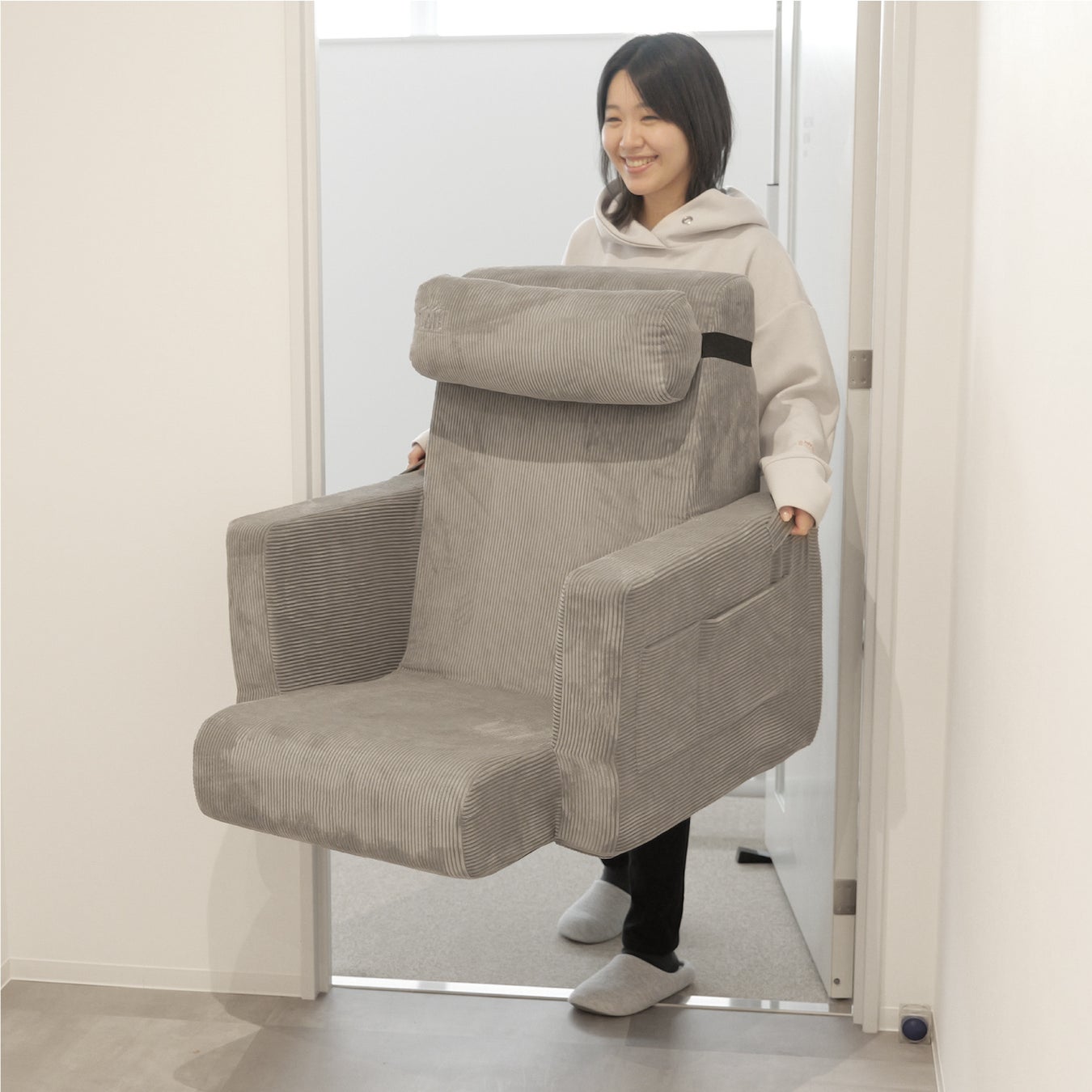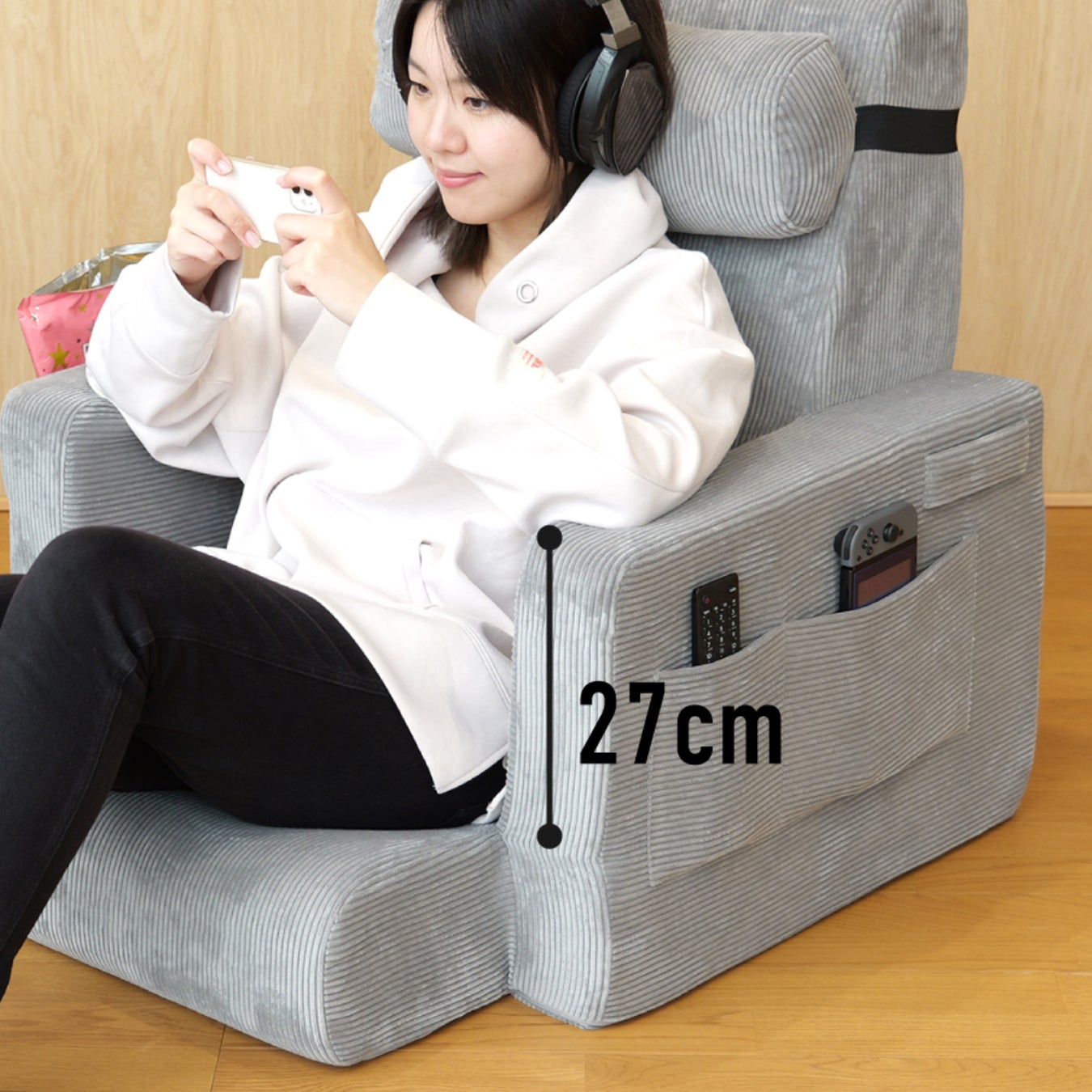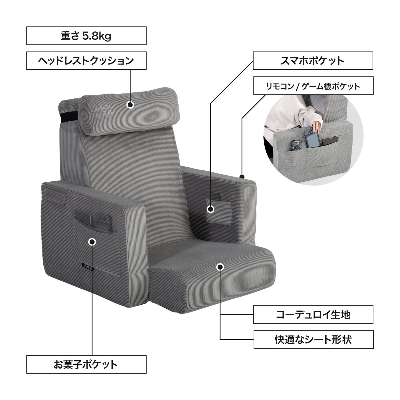 床でゲームをするゲーマー向けに開発され、軽量(約5.8kg)で持ち運びやすく、大きな肘掛けと快適な座り心地が特徴です。