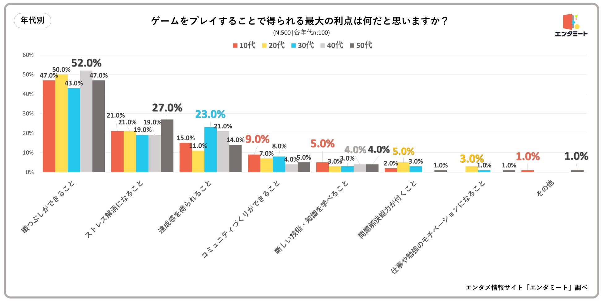 - ゲームプレイの最大の利点は「暇つぶし」で約50%。