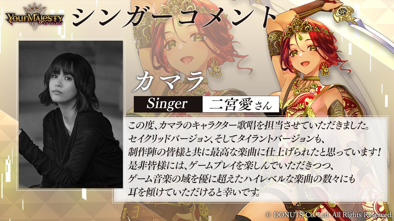 株式会社DONUTSが運営するスマートフォン向けRPG『ユアマジェスティ』は、実力派シンガーソングライターの二宮愛を新シンガーに起用しました。