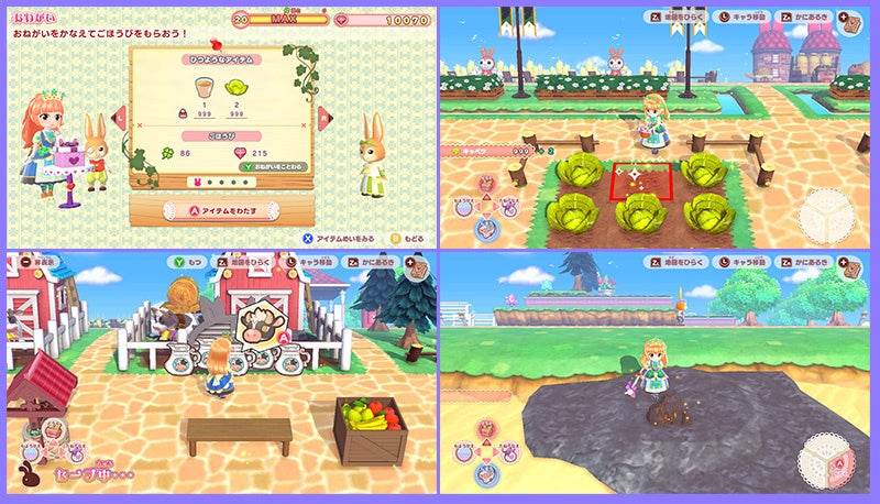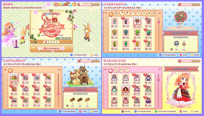 島のみんなの 「おねがい」をたくさん叶えてあげると、プリンセスのできることがどんどん増えていきます。また、作った商品をマーケットで販売することで、お金が貯まり、新しい材料や道具、島を彩るデコアイテムや建物を買ったり、プリンセスのドレスなどを手に入れることができるようになります。こうして、島のみんなの 「おねがい」をどんどん叶えていくことで、初めは何もなかった島が、賑わいを取り戻していきます。
