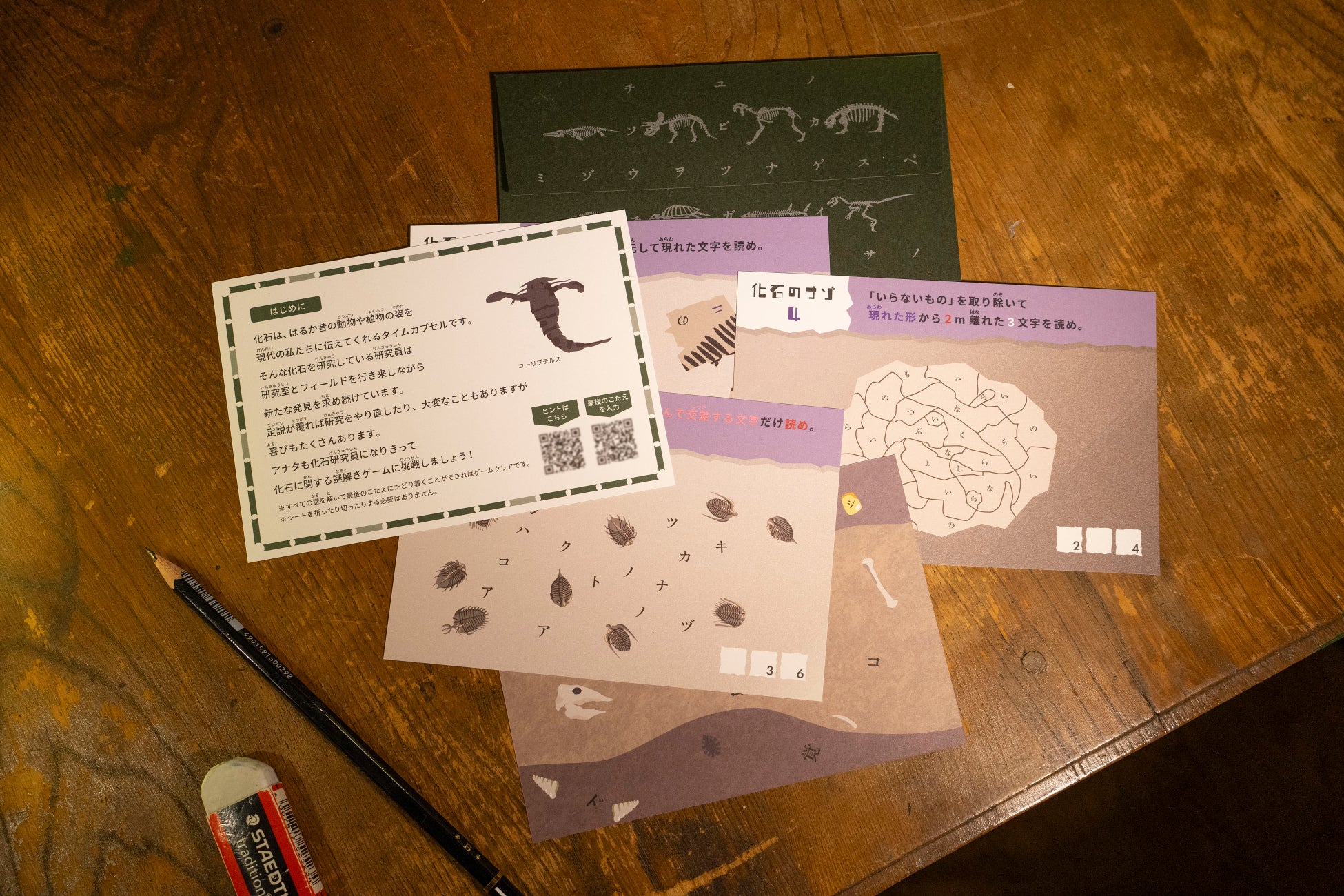 緑の封筒の中に、化石に関する謎が散りばめられたポストカード5枚が入っており、化石調査員のワクワク感を体験できる内容です。