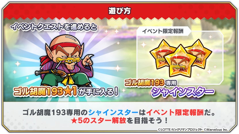 イベントでは、ゲームオリジナルストーリーが展開され、☆1キャラ「【流浪の雇われ稼業】ゴル胡魔193」を入手できます。