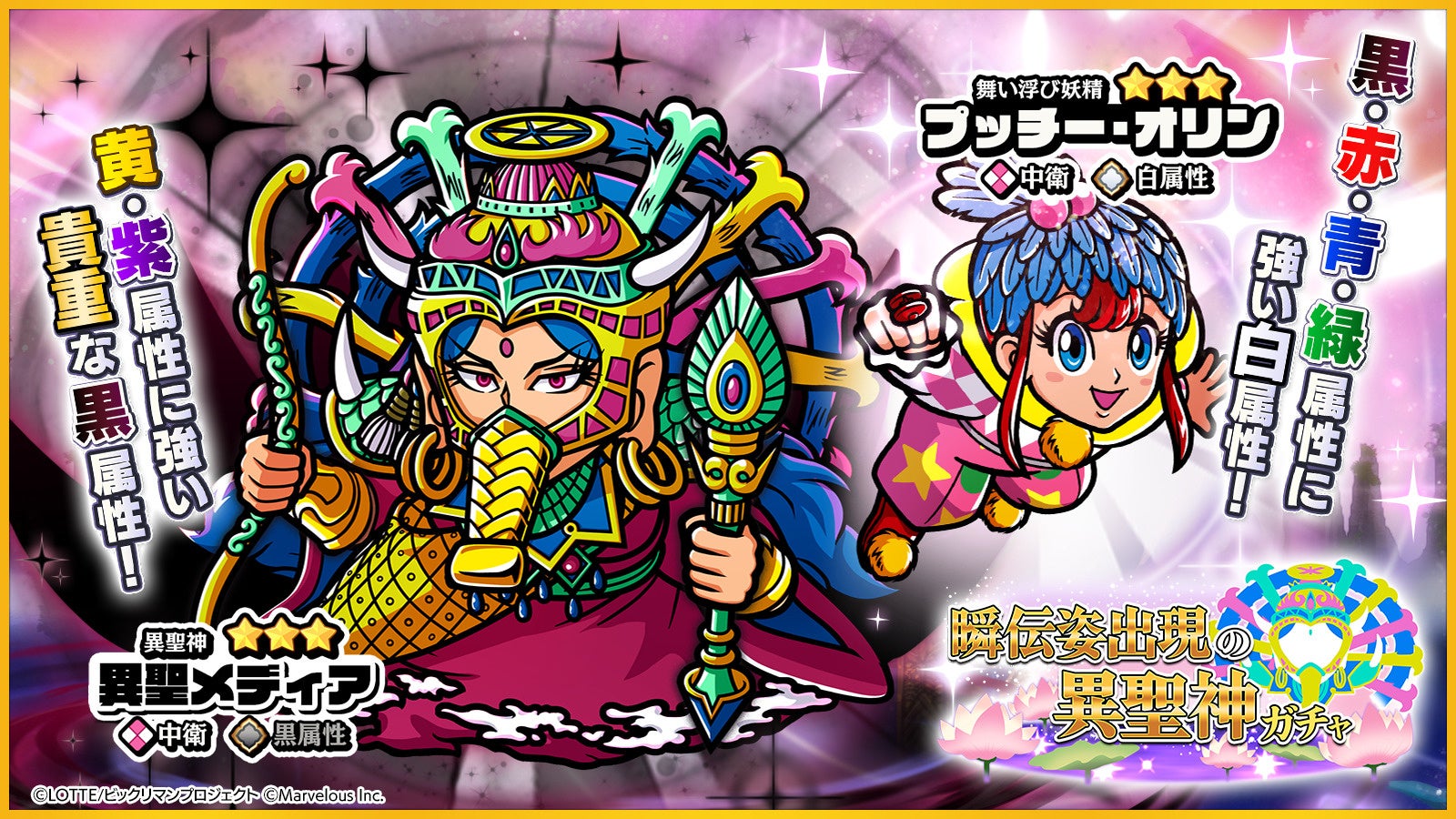 同時に、新キャラ「異聖メディア」、「プッチー・オリン」が登場する「瞬伝姿出現の異聖神ガチャ」も開始。
