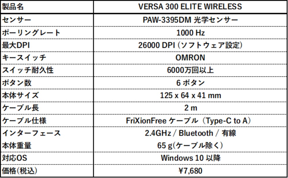 • 軽量65gで快適な操作性を実現するゲーミングマウス「VERSA 300 ELITE WIRELESS」を発売