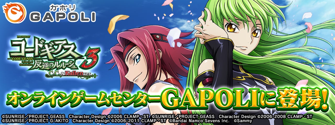 株式会社サミーネットワークスが運営するオンラインゲームセンター『GAPOLI』では、サミー株式会社の「パチスロ コードギアス 反逆のルルーシュ3 C.C.&Kallen ver.」が配信されます。