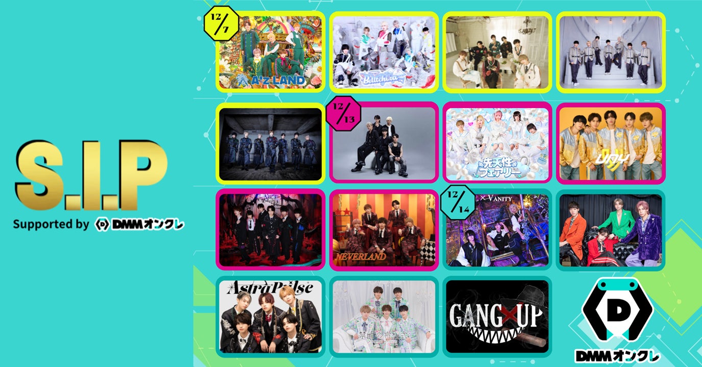 DMMオンクレは、2024年12月7日(土)、13日(金)、14日(土)の3日間、総勢15組のメンズグループが出演するライブイベント「S.I.P Supported by DMMオンクレ」を開催します。