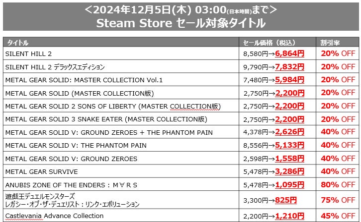 さらに、『METAL GEAR SOLID: MASTER COLLECTION Vol.1』や『Castlevania Dominus Collection』などの人気タイトルもセール対象です。