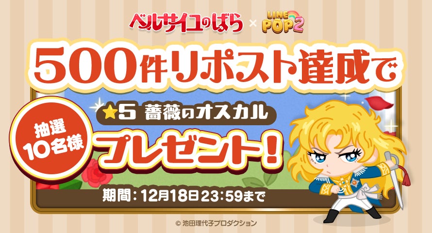 LINEヤフー株式会社は、スマホゲーム「LINE POP2」において、『ベルサイユのばら』とのコラボレーションイベントを2024年11月29日(金)11:00~12月26日(木)10:59に開催します。