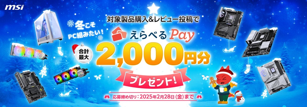 エムエスアイコンピュータージャパン株式会社は、2024年12月1日(日)~2025年2月28日(金)の期間、対象のマザーボード、水冷クーラー、電源ユニット、PCケースを購入し、指定サイトにレビュー投稿したユーザー全員に、最大2,000円分のえらべるPayをプレゼントする「冬こそ自作PCレビューキャンペーン」を実施します。
