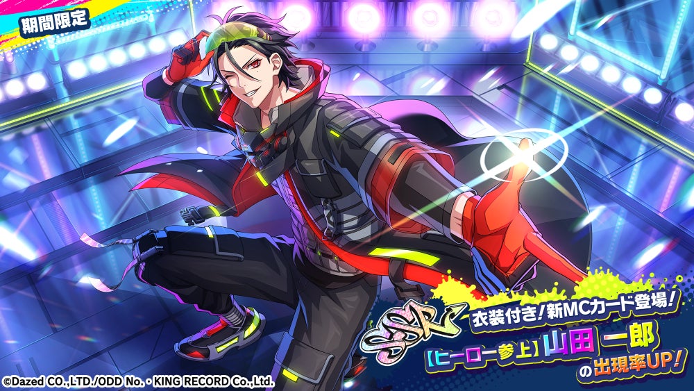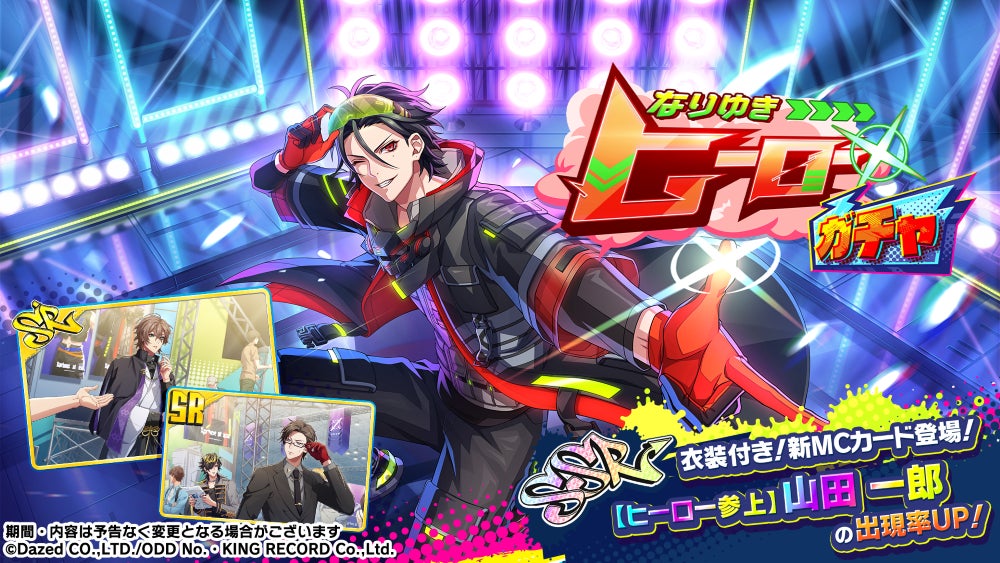 同時に、ヒプドリ初の衣装付きMCカードSSR【ヒーロー参上!】山田一郎が登場する「なりゆきヒーローガチャ」も開催され、新規カード3枚が追加されます。