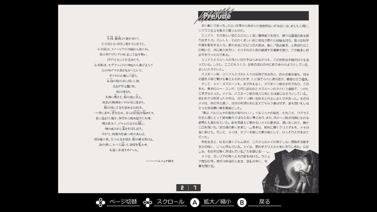 Nintendo Switch版では、「シーンセレクト」モードや、当時のマニュアルなどを閲覧できる「ギャラリー」モードが追加されています。