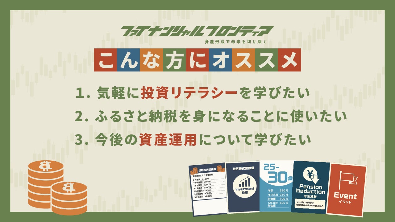ゲームを通じて、楽しみながらお金や人生、投資、資産形成について学ぶことができ、金融教育セミナーへの参加チケットも含まれています。