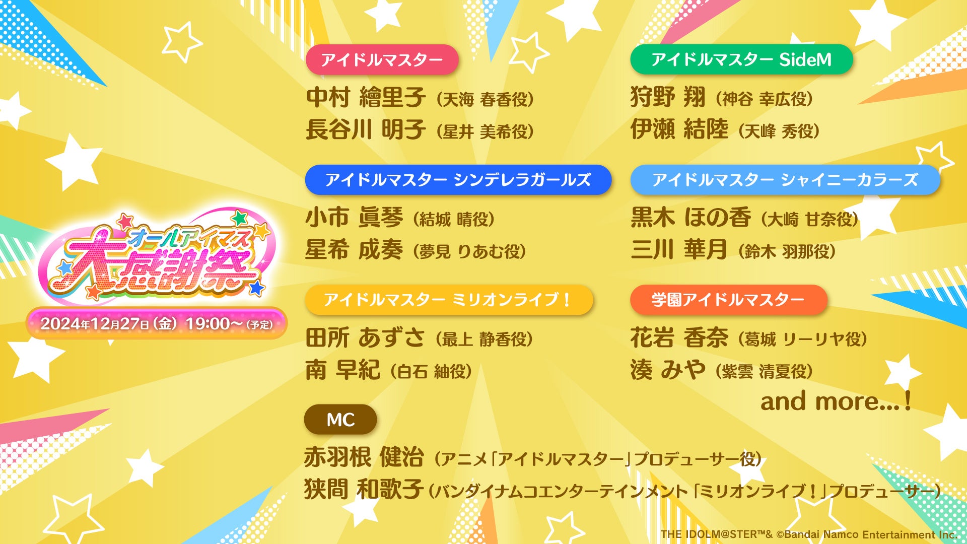 バンダイナムコエンターテインメントは、『アイドルマスター』シリーズ20周年イヤーを記念した特別生配信「オールアイマス大感謝祭 ~2025年までもう待てない!生配信~」を2024年12月27日(金)19:00から配信することを発表しました。