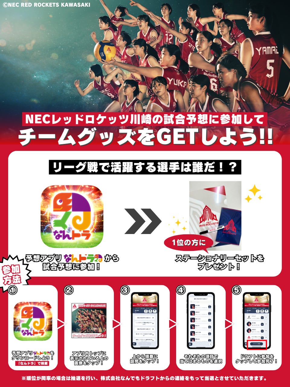 試合の展開や活躍選手を予想し、1位にはNECレッドロケッツ川崎のステーショナリーセットがプレゼントされます。