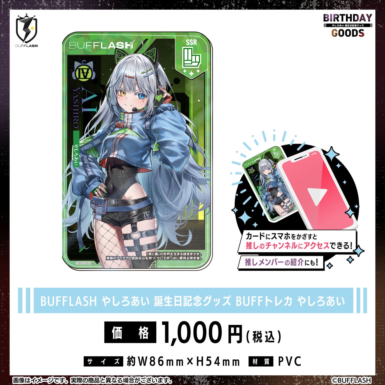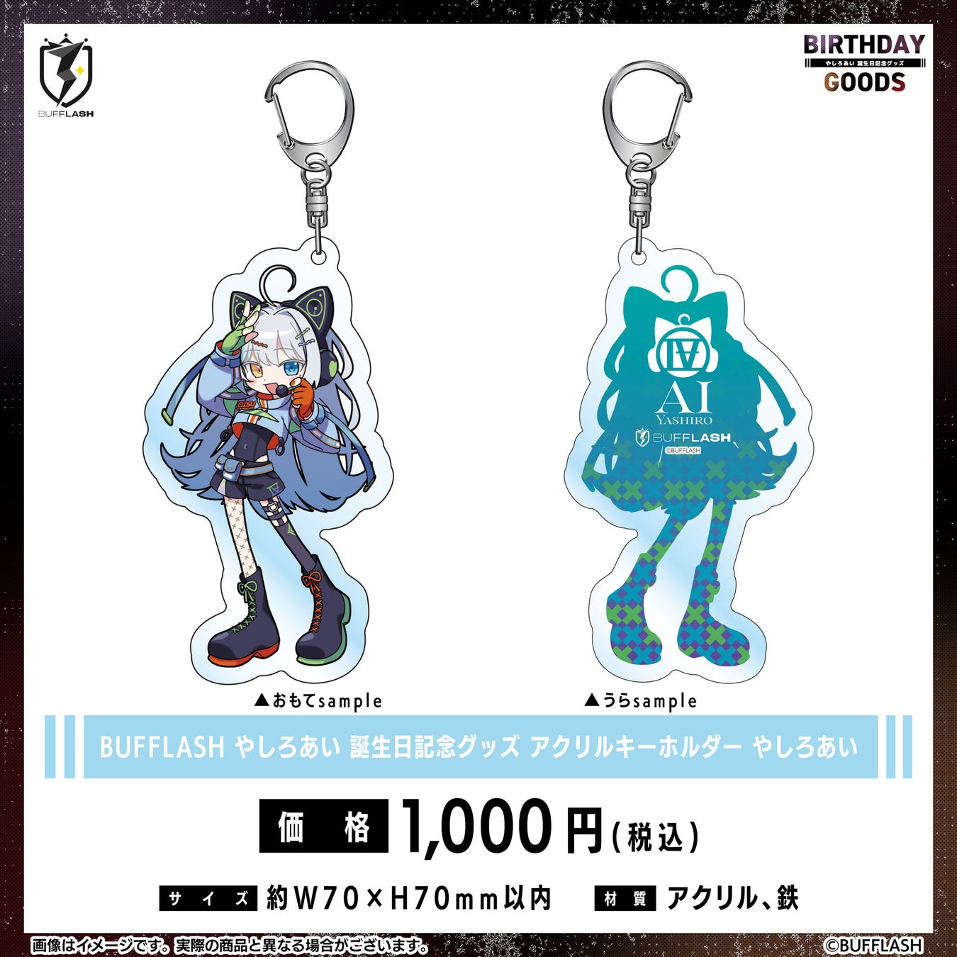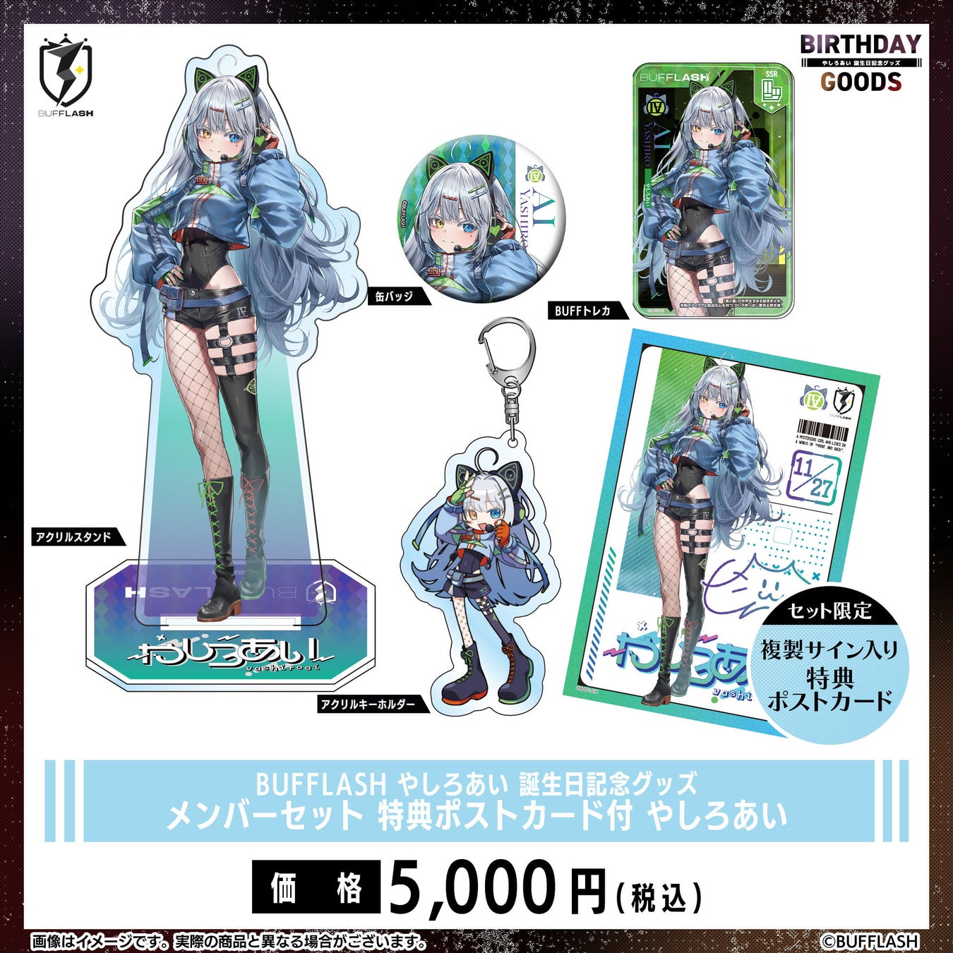 販売されるグッズは、缶バッジ、アクリルキーホルダー、アクリルスタンド、BUFFトレカ、そしてこれら全てをセットにしたメンバーセットです。