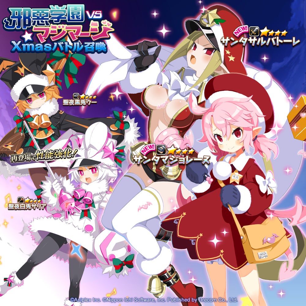 新キャラクター「サンタサルバトーレ」「サンタマジョレーヌ」が登場し、「邪悪学園VSマジマージ Xmasバトル召喚」で入手可能です。