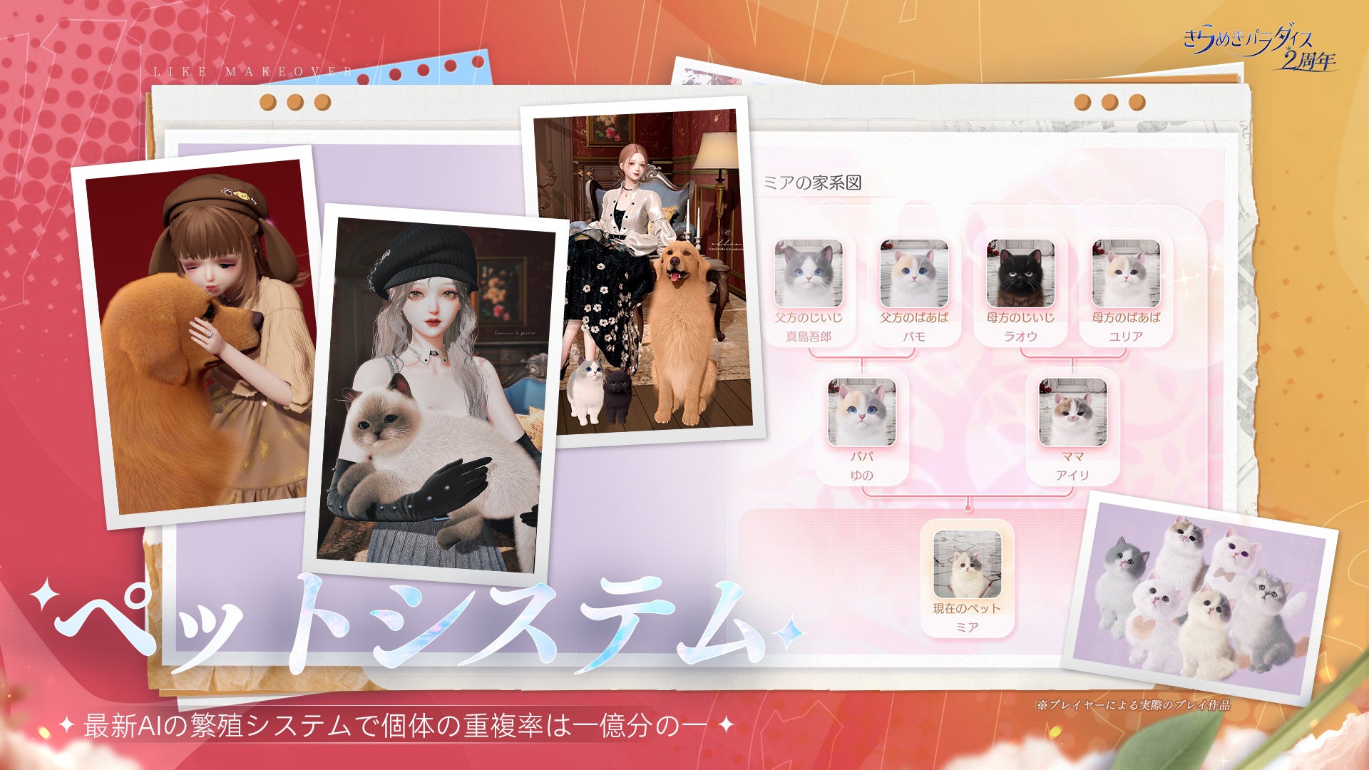 さらに、マイホーム作成、ペット育成、オリジナル衣装デザイン、充実のフォト機能、活気のあるコミュニティ機能なども備えています。