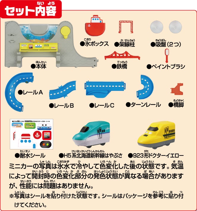 - 新幹線は氷水のトンネルを通ると色が変わり、お湯と氷水で何度でも楽しめる