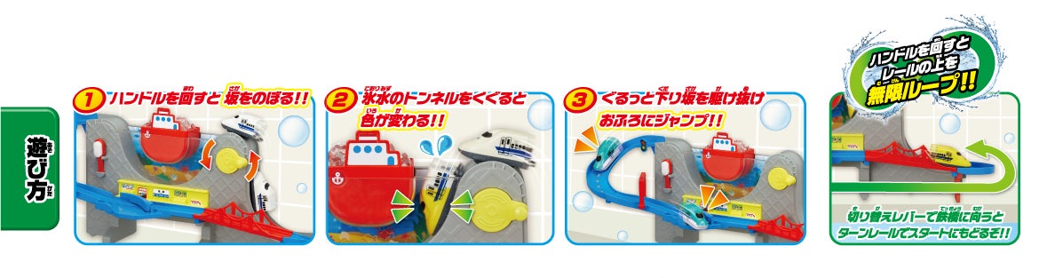 - ハンドルを回して新幹線を走らせたり、お風呂にジャンプさせたりして遊ぶことができる