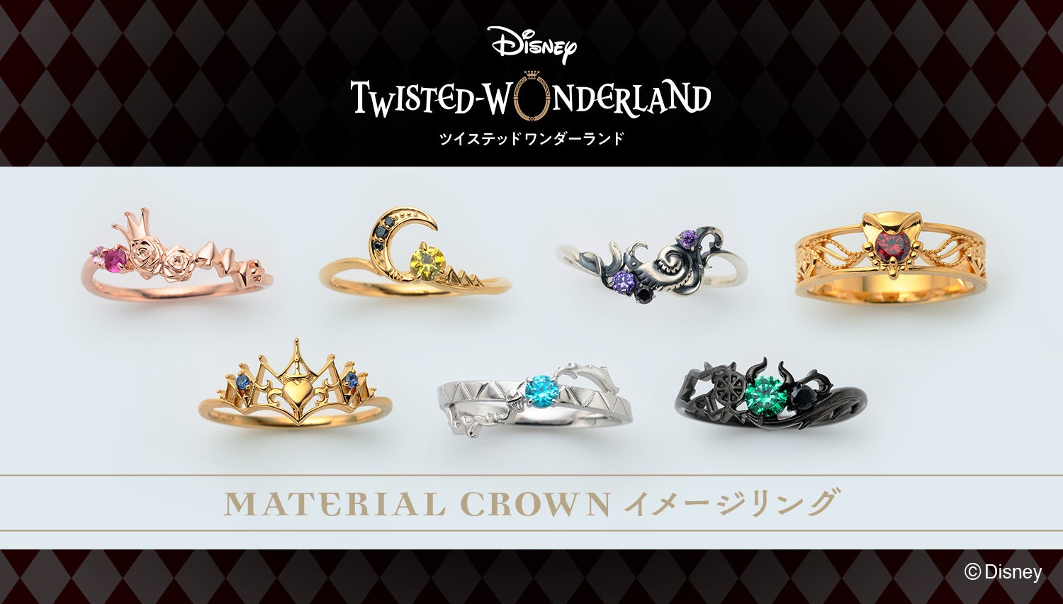 株式会社バンダイは、『ディズニー ツイステッドワンダーランド』とMATERIAL CROWNのコラボレーションリング全7種を、プレミアムバンダイとMATERIAL CROWNオンラインショップで2024年12月9日12時より予約開始することを発表しました。