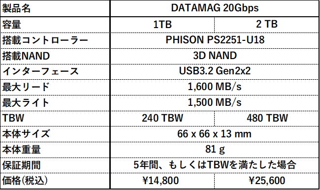 - USB3.2 Gen2x2対応で最大リード1,600MB/s、最大ライト1,500MB/sの高速転送を実現