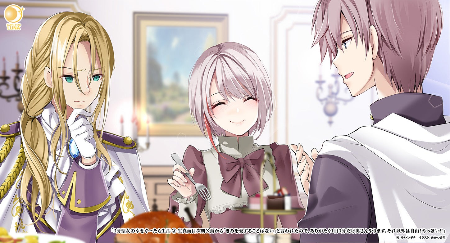 物語は、過労死寸前の聖女ノイシャが次期公爵リュナンに身請けされ、毎朝3分だけラブラブ夫婦を演じる契約結婚をすることから始まります。