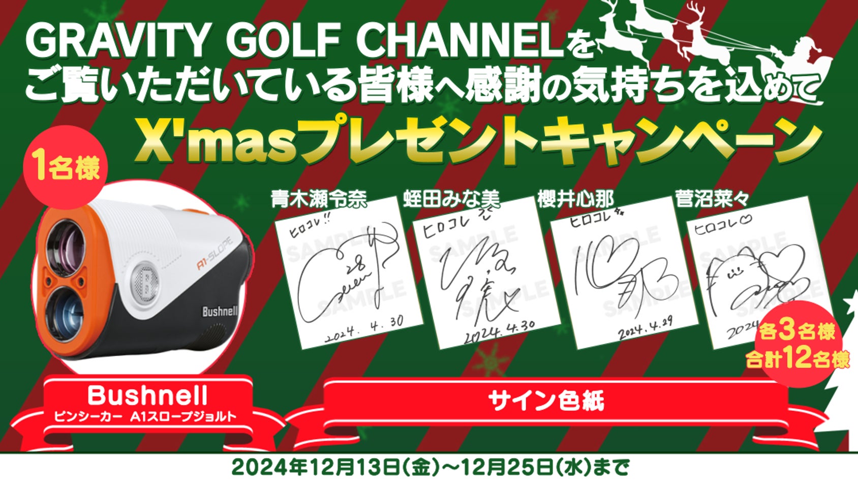 賞品はゴルフ用レーザー距離計1名様、女子プロゴルファーサイン色紙12名様(青木瀬令奈プロ、蛭田みな美プロ、菅沼菜々プロ、櫻井心那プロ)。