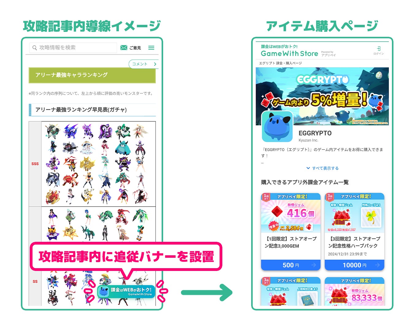 GameWithの攻略情報ページにアプリペイへの導線を設置することで、スムーズな課金誘導を実現し、アプリ外課金の利用率向上を目指します。