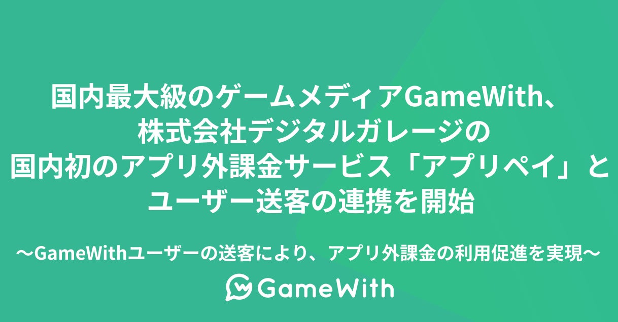 国内最大級のゲームメディアGameWithと、デジタルガレージのアプリ外課金サービス「アプリペイ」がユーザー送客で連携を開始しました。