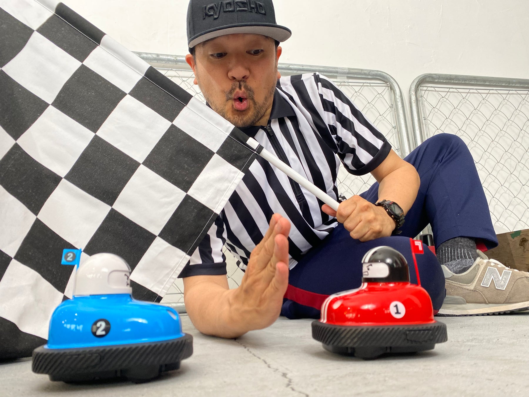 この「R/C ガチンコレーサー」は、赤と青の2台のカートがあり、カート同士をぶつけて相手ドライバーを飛ばすことが目的です。