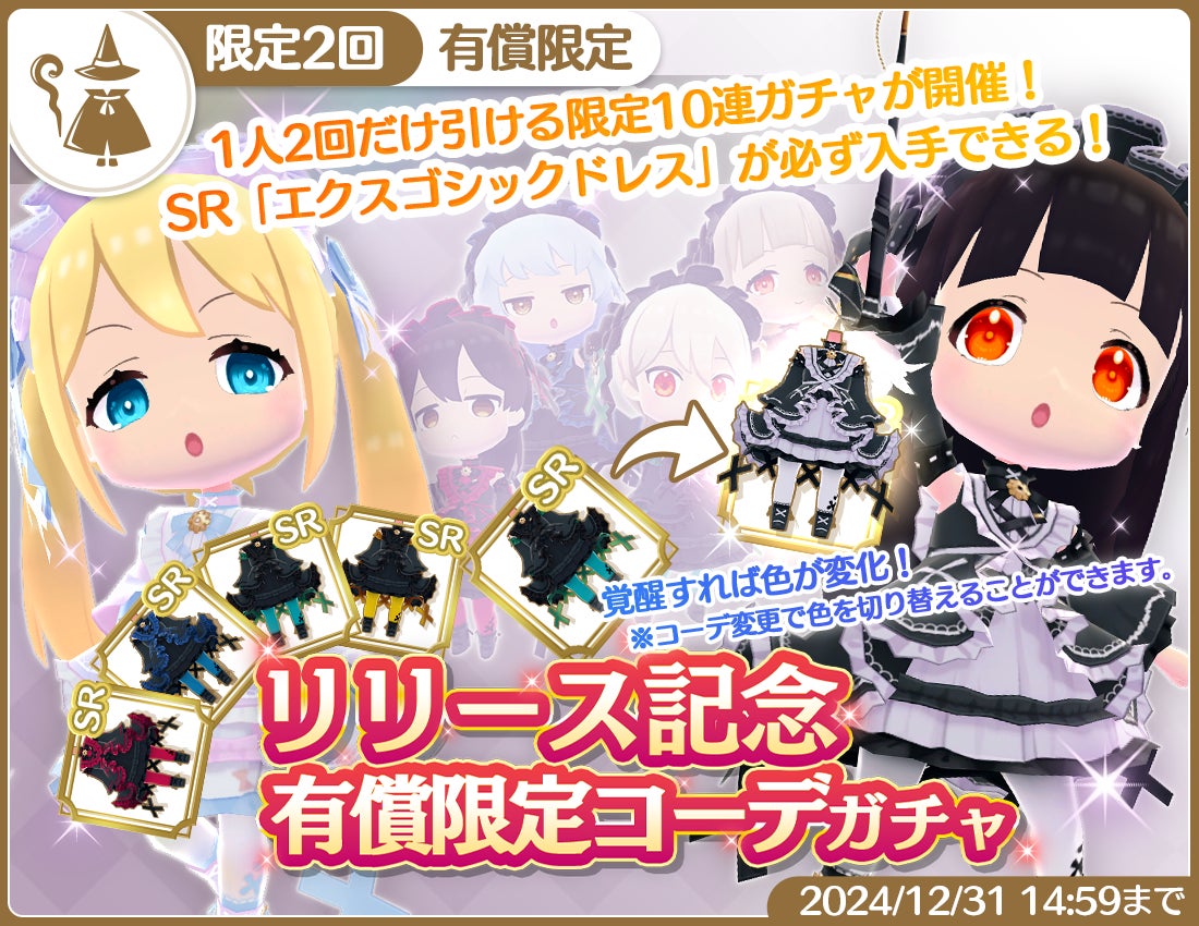 配信開始を記念して、SR「エクスゴシックドレス」確定ガチャや、エクスゴシックシリーズのピックアップガチャ、お得なリリース記念パックの販売、Amazonギフトカードが当たるXキャンペーンなど、複数のキャンペーンが実施されている。