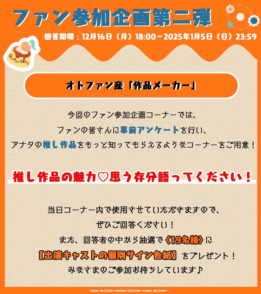 また、ファン参加企画として「オトファン産「作品メーカー」」の回答受付も実施中で、回答者の中から抽選で出演キャストのサイン色紙がプレゼントされます。