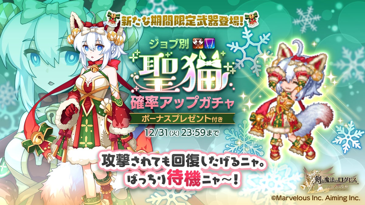 新武器「聖猫の魔神器」が登場するガチャや、イベント「ログレスユートピア」のエピローグ追加、ログインボーナスとして魔晶石100個プレゼントなど、様々なキャンペーンが実施されています。
