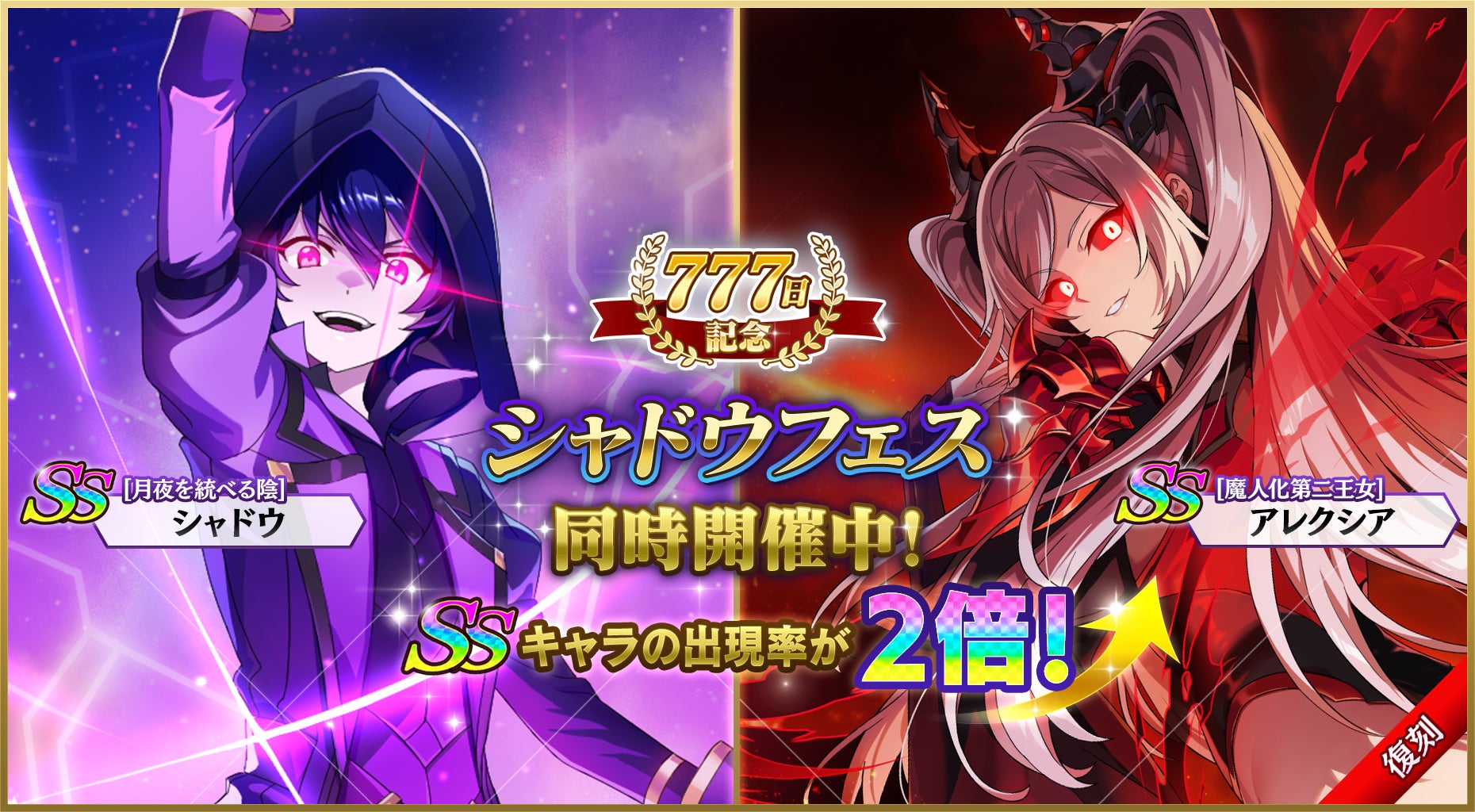 さらに、新キャラクター[月夜を統べる陰]シャドウと魔人化アレクシアが復刻登場し、シャドウフェスガチャではSSキャラの出現率が2倍にアップします。