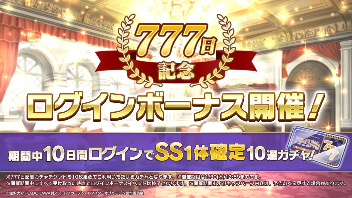 スマホゲーム『陰の実力者になりたくて!マスターオブガーデン』(カゲマス)は、リリース777日記念キャンペーンを開催します。