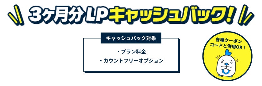 このキャンペーンでは、20GB以上のプランとカウントフリーオプションを契約し、月次決済を3回完了すると、プラン料金とオプション料金の3ヶ月分がLPキャッシュバックされる他、抽選で最大109連ガチャ分のリンクスマイルが当たるチャンスがあります。