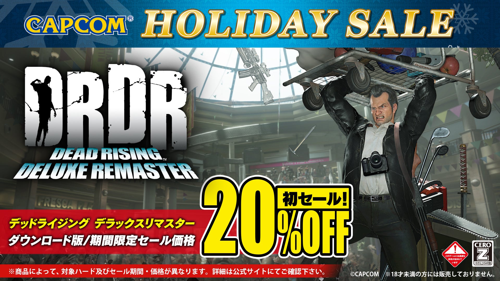 『デッドライジング デラックスリマスター』がカプコンホリデーセールで20%オフのセール価格で販売中であることを告知するプレスリリースです。