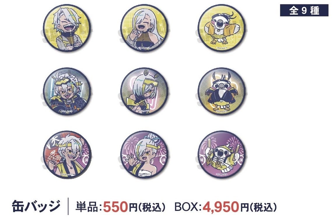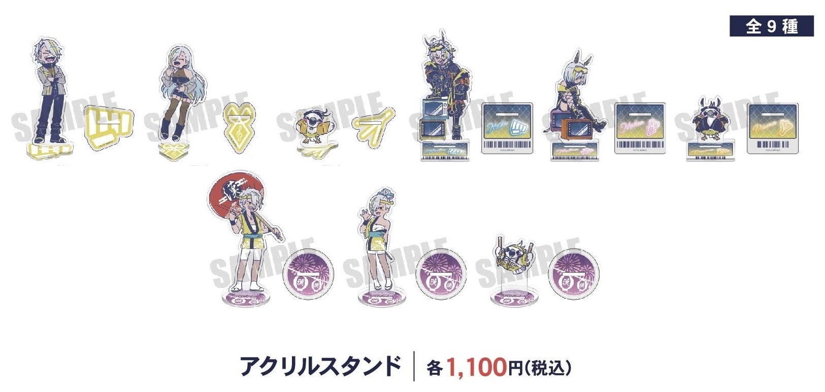 - アクリルスタンド、アクリルキーホルダー、ラバーキーホルダー、オーロラポーチ、フォンタブ、缶バッジ、ジョッキグラス、丼ぶり、ビッグアクリルスタンドが販売