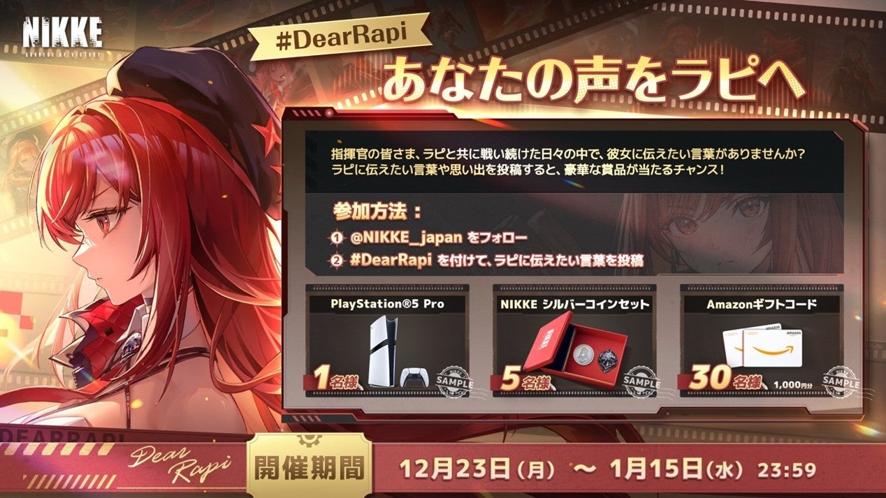 また、ゲーム内では100連以上のガチャチャンス、リアルイベントとして「NIKKEオーケストラコンサート」と「コミックマーケット105」への出展、SNSキャンペーン「#DearRapi」などが開催されます。
