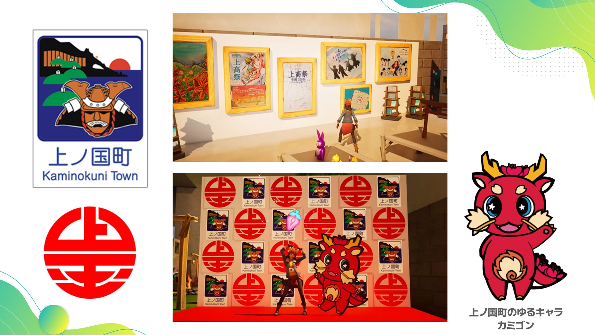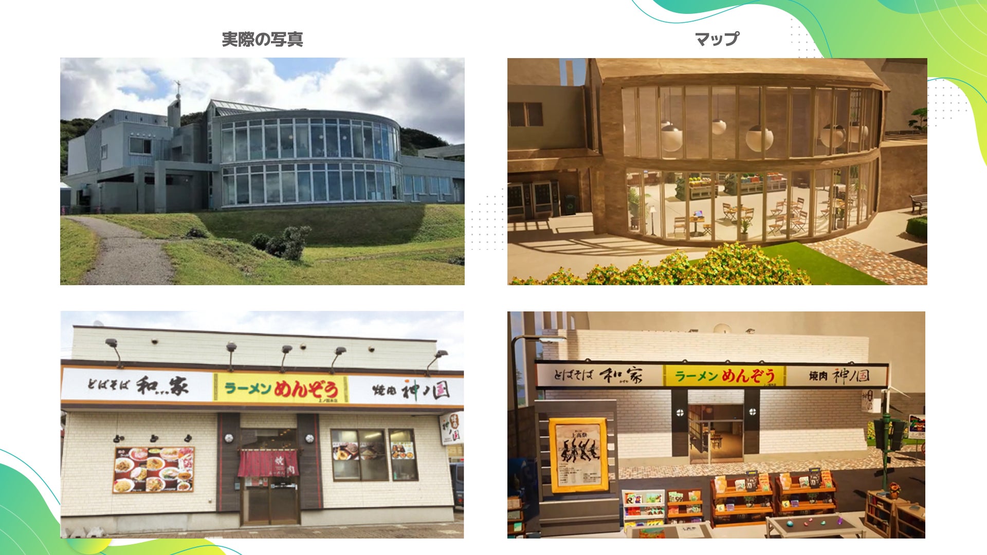 このマップは、上ノ国町の魅力発見ワークショップに参加した学生のアイデアに基づき、同町のゆるキャラ「カミゴン」のフォトブースや道の駅、ラーメン屋など、上ノ国町の街並みや名所をリアルに再現しています。