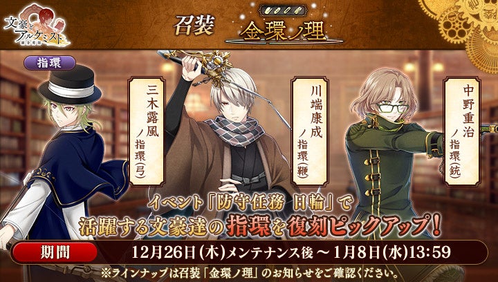 DMM GAMESの女性向け文豪転生シミュレーションゲーム「文豪とアルケミスト」で、12月26日よりイベント『防守任務「日輪」』と限定召装『聖夜ヲ楽シム準備』が開催されました。