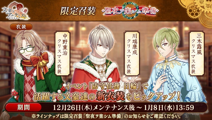 『聖夜ヲ楽シム準備』では、中野重治、川端康成、三木露風のクリスマス衣装が一定の確率で入手可能です。