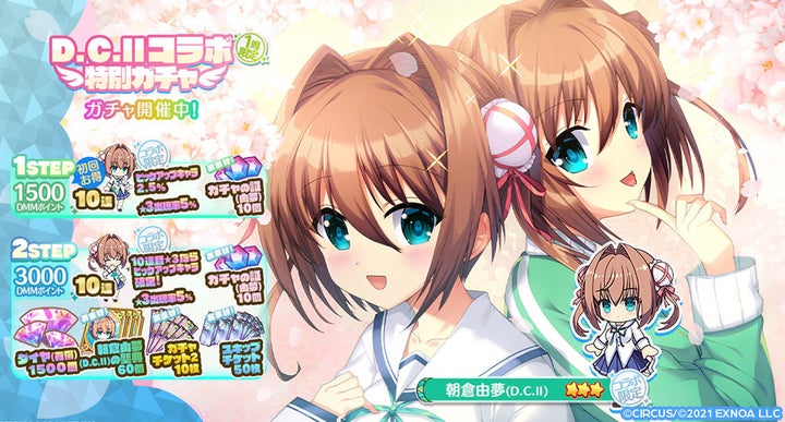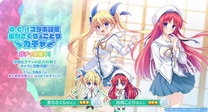 さらに、コラボ限定キャラ「★3 朝倉由夢(D.C.Ⅱ)」が登場するピックアップガチャや、「★3 芳乃さくら(D.C.)」、「★3 白河ことり(D.C.)」の復刻ガチャも開催されています。